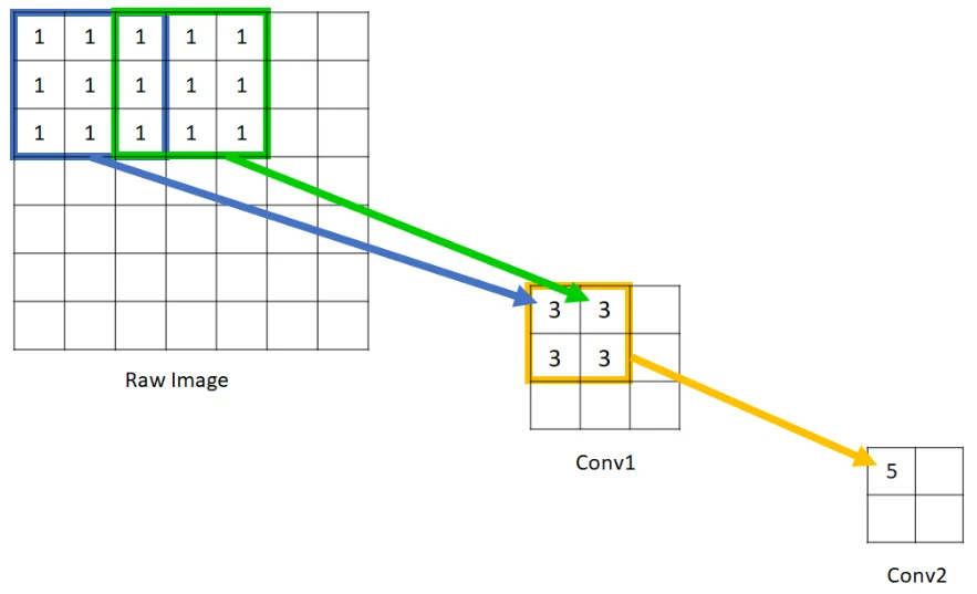 感受野:可以简单理解:比如说一个512x512图像,最开始用卷积核(假设为3x3)去“扫”,那么这个卷积核就会把其“扫”的内容“汇总”起来,比如说某一个值是汇聚了他周围其他的值,这样一来细节的感知就很多,但是随着网络层数叠加,这些细节内容就会越来越少,但是计算得到的每个值却是“了解”到了更加“全局”的内容,如下图展示一样