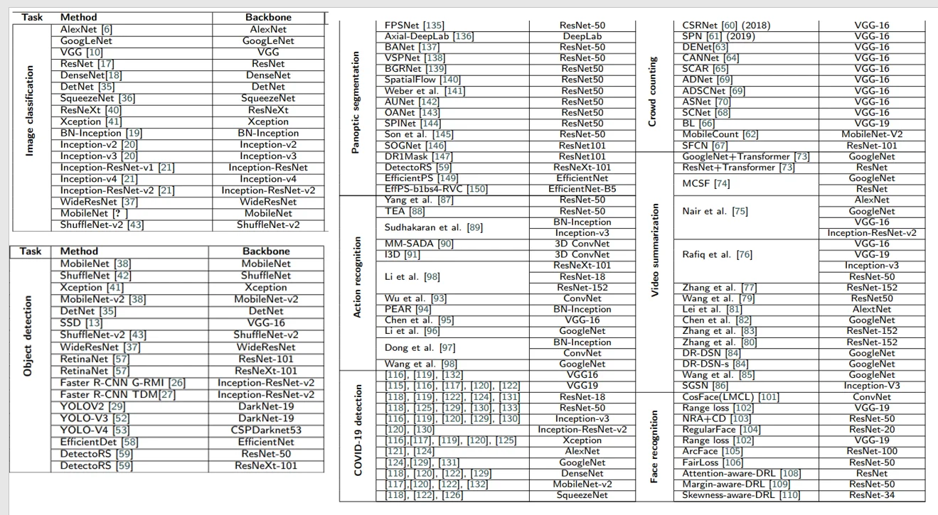 主要介绍在CV中常用的Backbone原理简易代码(代码以及原理经常更新),参考论文中的表格,对不同的任务所使用的backbone如下: