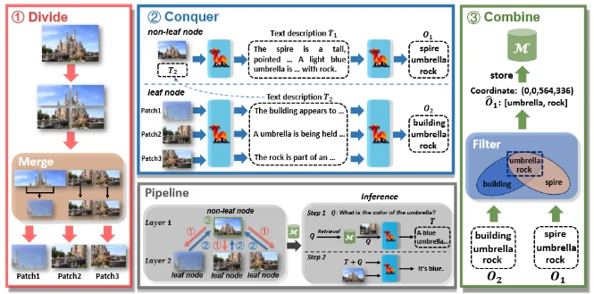 patch都是$448\times448$,因此:$800/448: 1300/448≈2:3$,因此先将图片扩大到:$448\times2,448\times3=896\times1344$,然后再去切割即可DC^2:处理高分辨率图像(4K/2K),论文提出通过将图像固定到一个固定的分辨率会导致较大的信息损失,增加模型的不确定性,但是可以通过添加文本信息进行补偿(将文本和image进行融合)。论文通过3步处理高分辨率图像:1、Divide:将图像切割为4部分(切割过多的patch会破坏目标完整性),然后计算每个部分之间的相似性,通过设定阈值来对形似部分通过 分层聚合的方式进行合并。2、Conquer:对于切分(并且进行合并)的patch以及完整的patch都生成文字描述,并且通过对生成的描述再通过llm抽取出里面的实体。并且将内容加入到完整的图像中并且进行类似处理。3、Combine:通过对leaf node以及no-leaf node提取到的实体,对两部分实体计算交集