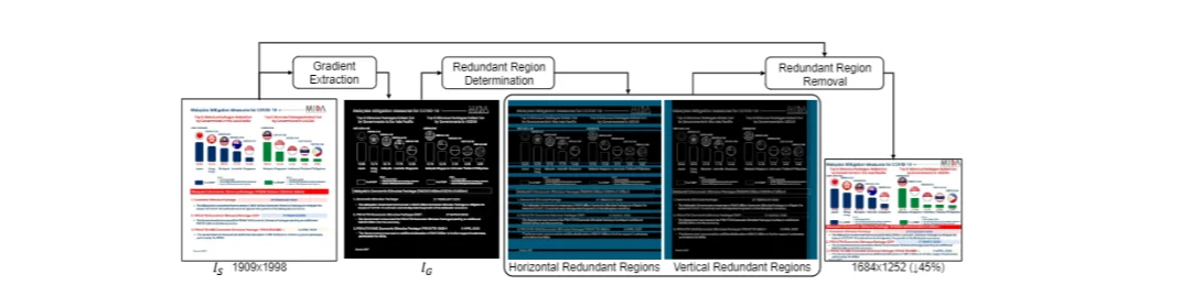 DocKylin直接对横平竖直去除冗余的像素(比如文本中大量的空白,直接通过将图片梯度转化(黑白),然后分别将水平/竖直方向上的“没有元素”内容进行连接然后继续去除,可以实现模型对高分辨率的图像的处理)