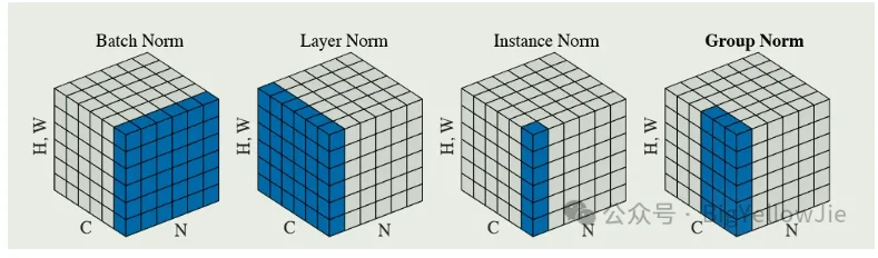 GroupNorm:是LayerNorm和InstanceNorm的折中。将通道(C)分成G个组(Group),然后在单个样本的每个组内,计算所有通道和空间位置的均值和方差。