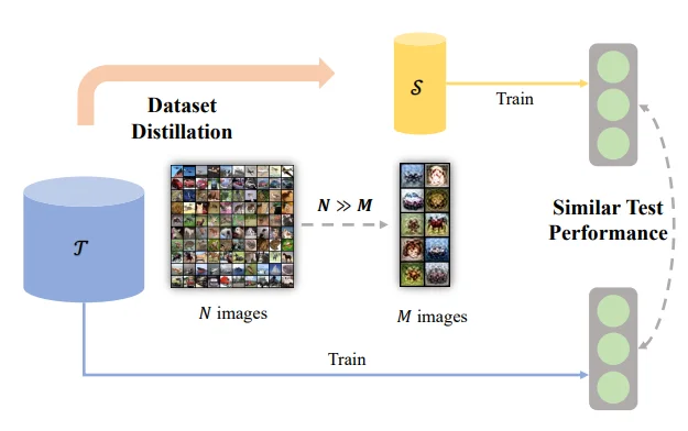 数据蒸馏(Data Distillatiob)是一种从大量数据中提取关键信息,生成高质量、小规模合成数据集的技术。它的目标是通过这些合成数据来替代原始数据集,用于模型训练、验证或其他任务,从而提高效率、降低成本或保护隐私。数据蒸馏的核心思想是“从数据中提取数据”,让合成数据集中保留原始数据集的关键特征和分布信息,同时去除冗余和噪声。参考论文1中的描述: