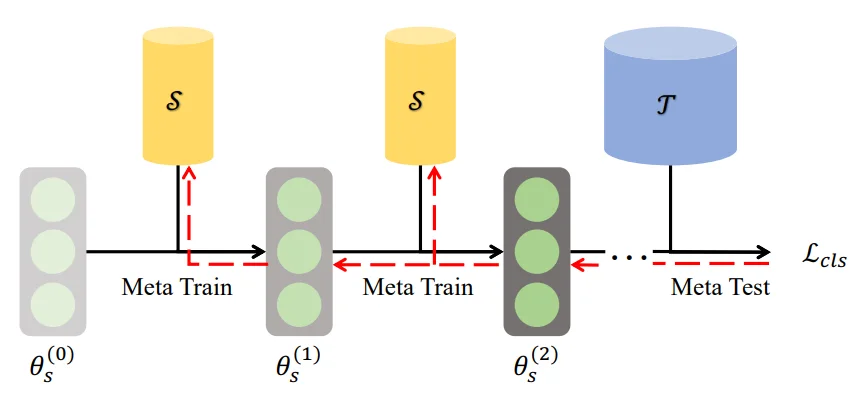 \[\begin{aligned} \mathcal{L}(S, T) &= \mathbb{E}_{\theta^{(0)} \sim \Theta} \left[ \mathcal{D}(\theta_S^{(T_s)}, \theta_T^{(T_t)}) \right] \\ \theta_S^{(t)} &= \theta_S^{(t-1)} - \eta \nabla l(S; \theta_S^{(t-1)}) \\ \theta_T^{(t)} &= \theta_T^{(t-1)} - \eta \nabla l(T; \theta_T^{(t-1)}) \\ \mathcal{D}(\theta_S^{(T_s)}, \theta_T^{(T_t)}) &= \frac{\|\theta_S^{(T_s)} - \theta_T^{(T_t)}\|^2}{\|\theta_T^{(T_t)} - \theta^{(0)}\|^2} \end{aligned}\]多步参数则是直接对数据S和T参数进行多步更新,优化目标为两部分数据所得到的参数$\theta_S$ 以及 $\theta_ T$
