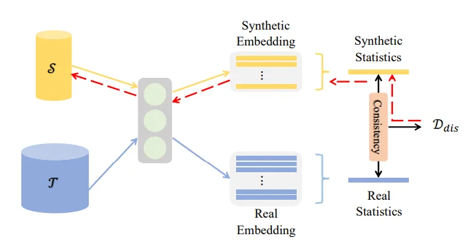 \[\mathcal{L}(S,T)=\mathbb{E}_{\theta \in \Theta}[\mathbb{D}(S,T;\theta)]\\ \mathcal{D}(S, T; \theta) = \sum_{c=0}^{C-1} \| \mu_{\theta,s,c} - \mu_{\theta,t,c} \|^2 \\ \mu_{\theta,s,c} = \frac{1}{M_c} \sum_{j=1}^{M_c} f_\theta^{(i)}(X_{s,c}^{(j)}), \quad \mu_{\theta,t,c} = \frac{1}{N_c} \sum_{j=1}^{N_c} f_\theta^{(i)}(X_{t,c}^{(j)})\]首先作者提到一点:通过分布式匹配进行数据蒸馏,容易导致无法获取分布的差异,进而导致效果不佳