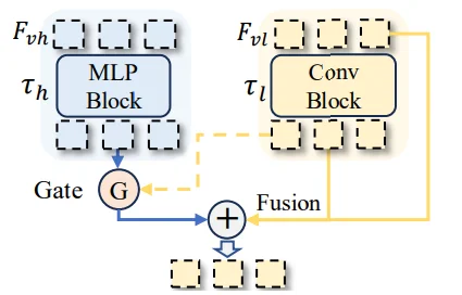 本文中使用的 MR-Adapter 操作:$F_{vl}=F_{vl}+f_l(F_{vl})+g\times f_h(F_{vh})$。处理思路也比较简答,通过公式也可以很直观理解(其中:$vl$ 代表低分辨率;$vh$ :代表高分辨率,$f_l, f_h$:则是分别代表卷积block和 MLP layer)值得注意的是其中的gate定义为: