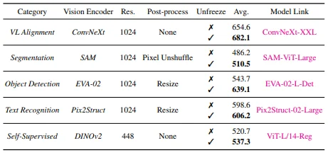 特征融合:对图像进行encoder之后,类似很多多模态中进行操作一样都会通过一个Projector(也就是简单的线性层进行处理),多视觉编码器处理完毕之后后续关键就是如何将编码后内容进行组合,在本文中所采用的方式是:Sequence Concatenation。也就是直接将内容进行横向拼接(比如说:image-encoder-1:1x4;image-encoder-2:1x4。那么拼接得到结果为:1x8)